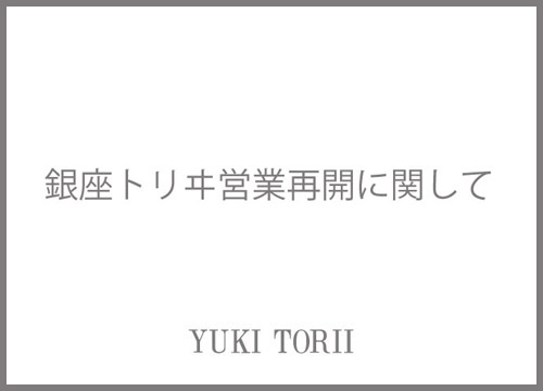 銀座トリヰは1月31日(土)より営業を再開いたします。 お客様に、ご不便・ご迷惑をおかけしまして、大変申し訳ございませんでした。 何卒よろしくお願い申し上げます。